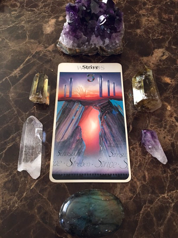 Today’s card is the 5 of Wands. It wants radical, aggressive movement and renewal. Combined with today’s number 9 of Universal love and selflessness it is asking us to give in. Let go. Quit trying to control outcomes which we don’t have control over anyway.