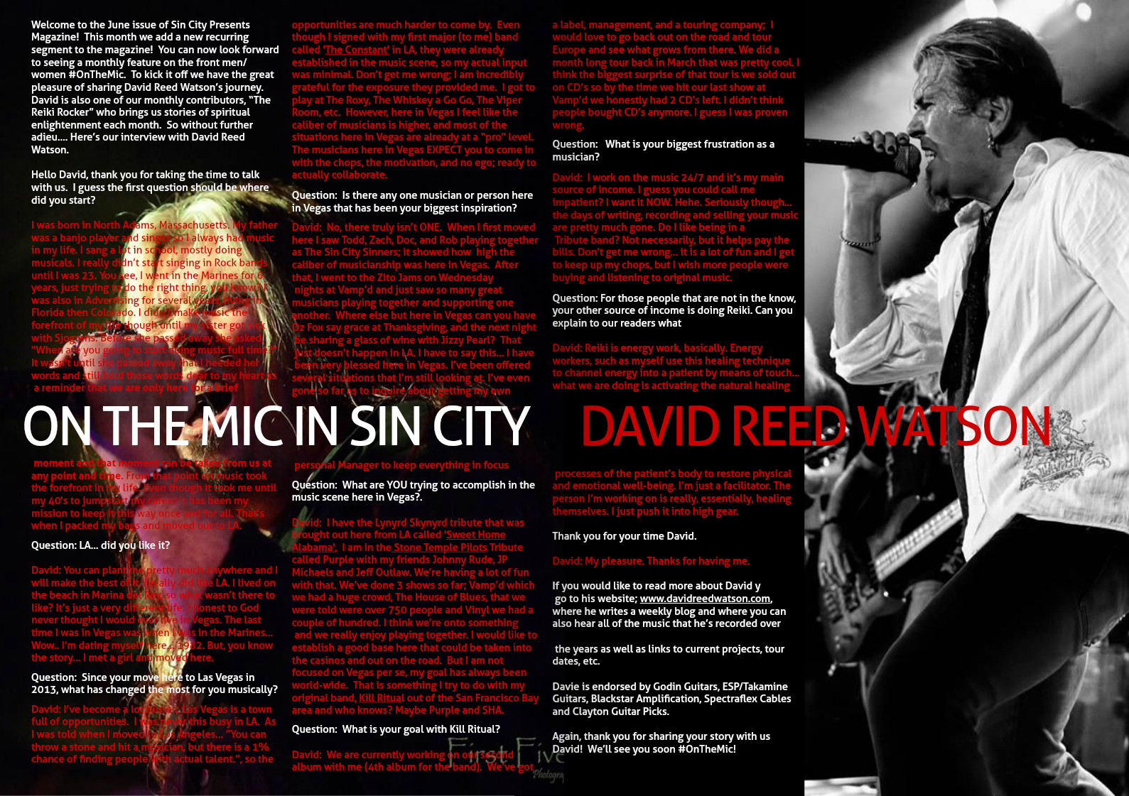 Welcome to the June issue of Sin City Presents Magazine! This month we add a new recurring segment to the magazine! You can now look forward to seeing a monthly feature on the front men/women #OnTheMic. To kick it off we have the great pleasure of sharing David Reed Watson’s journey. David is also one of our monthly contributors, “The Reiki Rocker” who brings us stories of spiritual enlightenment each month. So without further adieu…. Here’s our interview with David Reed Watson.