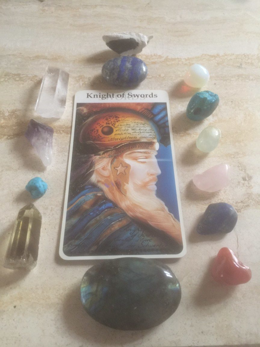 Today’s card is the Knight of Swords. Look at his eyes… they are like laser’s pointing toward a goal. A good expression for today would be, ‘No Holds Barred’. Having absolutely no limitations or restrictions. Combined with the energy of the 7 which is telling us to go within, get precise. What is it that we want to say today? Make everything you say and do today count.