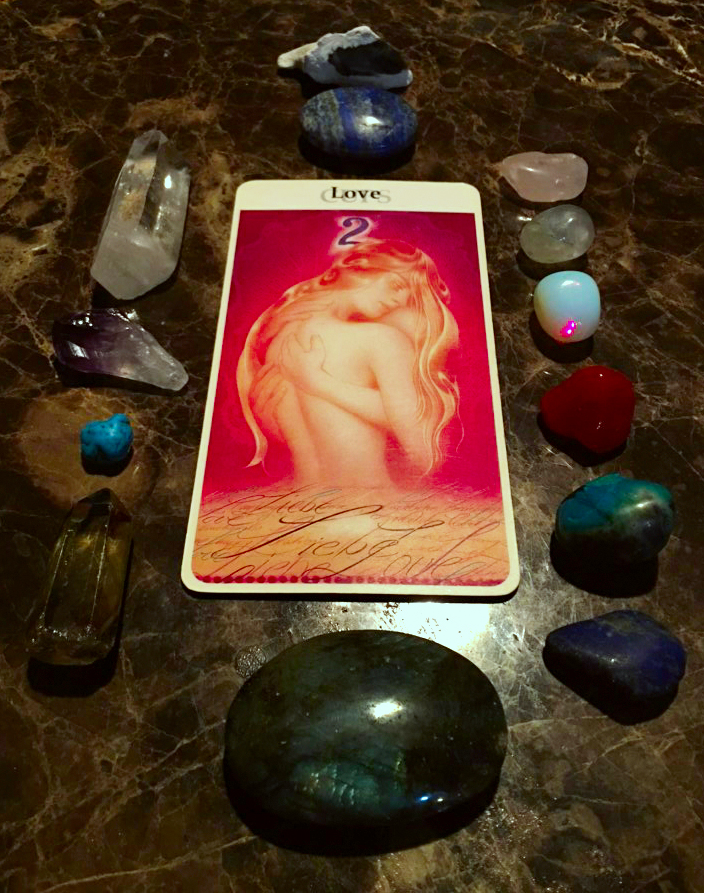 Today’s card is the 2 of Cups, Love! Combined with the 3 energy of the love of pleasure, growth, and expansion it is reminding us that we must love ourselves first and foremost.