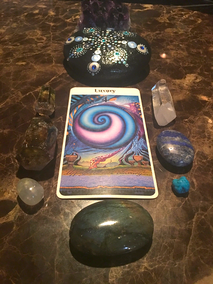 Today’s card is the 4 of Cups. Like every card and number, there is a Yin/Yang, positive/negative to each. Today’s 4 of cups talks about the stability of feelings, love without risk and emotional enrichment. On the negative side, it can be possession and restriction.
