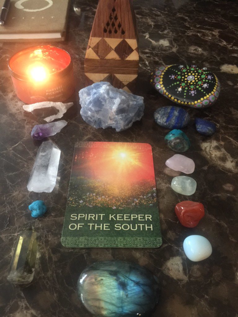 The Native American medicine wheel, the south side of it, represents the noonday sun, harmony, and rapid growth. The Spirit Keeper of the South, Shawnodese, the manifestation of the Coyote. The Coyote is the teacher, guiding us through life and all of our lessons.