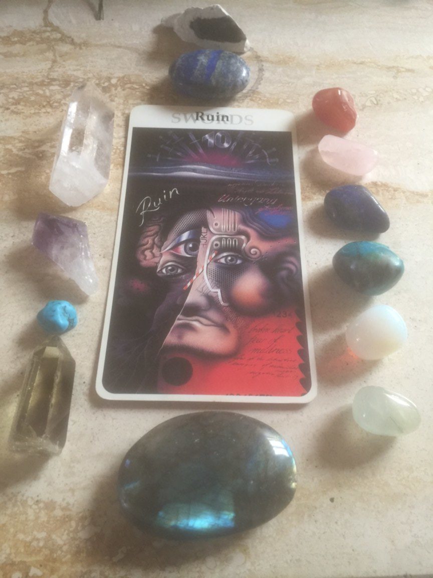 So yesterday we had the Death card… what came up for you? Did you notice anything in particular? Well, if you did, you are well on your way because today’s card, although a seemingly negative card, it is telling us that everything that we’ve been suffering was all a perception. Our perception. Notice the letters and the numbers on the card; HJKL and 1234. What do you notice about each group?