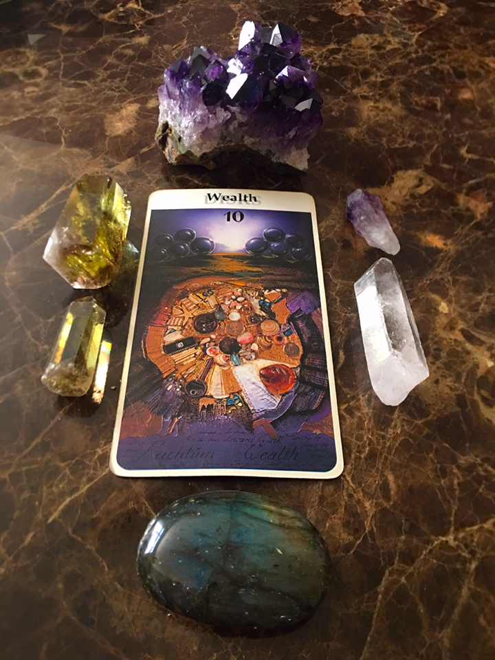 The 10 of Disks is the Wealth card. You will never obtain spiritual nor material wealth with those old mantras running through your head… actually, let me rephrase that. You’ll never be HAPPY with those mantras running through your head. You might gain material wealth but it will never be enough. I believe our society is set up this way. Believe me… I was in advertising for years. Our job was to make you feel like you didn’t have enough. You weren’t driving the best car, you didn’t have the best phone, you weren’t eating the best meals. It is a never ending setup for failure that leaves you wanting.